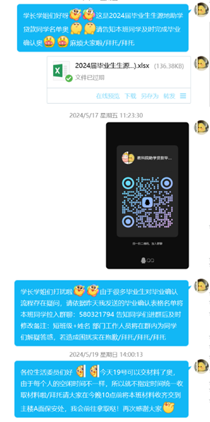 其次,由勤工助学部负责点对点通知,确保毕业生知悉上述通知。同时,在活动期间,勤工助学部详细询问各毕业生计划还款时间,告知生源地助学贷款毕业确认需要进行的操作流程,为他们答疑解惑,根据不同情况,收集相关材料。