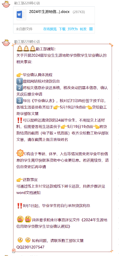 首先,活动负责人韩心语发布应届毕业生生源地助学贷款毕业确认通知,请2024届申请生源地助学贷款的毕业生认真阅读并进行对应操作。