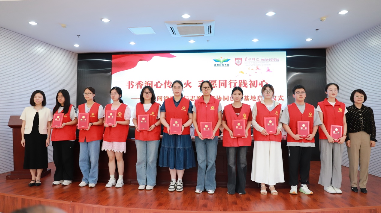 共建仪式上,冯永玲和吕杨为“阅读推广与志愿服务协同创新基地”揭牌,陈晔和韦琴为志愿者代表颁发聘书,王登佐致辞,教科院志愿者代表张琳茗作表态发言。
