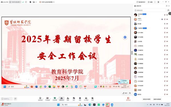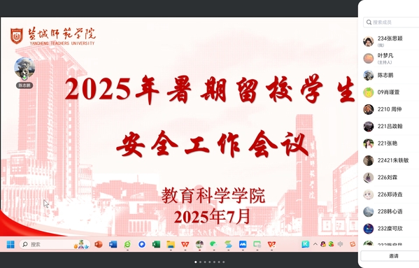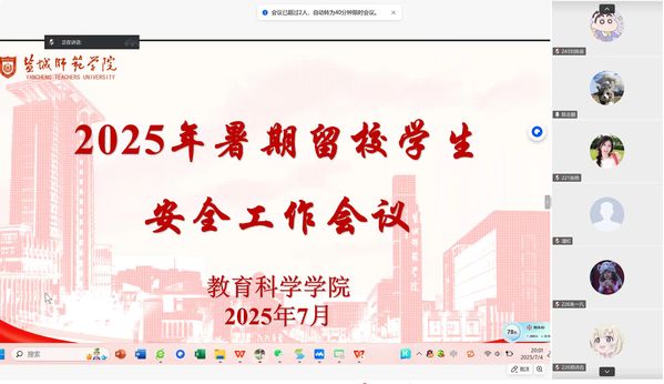 为充分发挥“一站式” 学生社区服务育人功能,切实保障暑期留校学生的人身与财产安全,营造安全舒适的校园环境,7月4日晚8点,学院线上召开2025年暑期留校学生安全工作会议,留校辅导员及全体暑期留校学生参会。