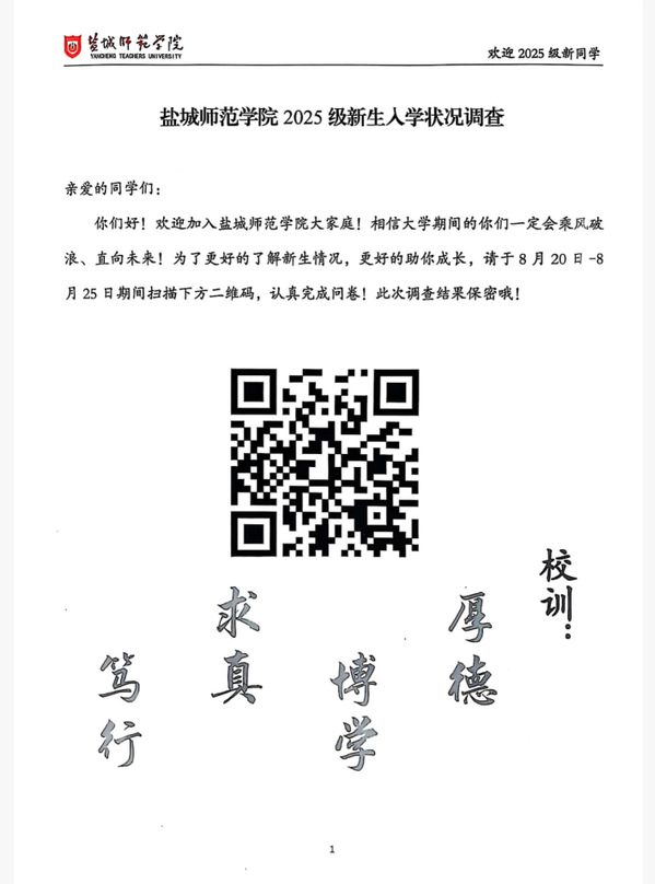 根据录取通知书要求,请在8月20日- 8月25日期间,扫描下方二维码认真填写。每一个选项背后,都是学校为精准提供入学支持做的准备。无需担心信息泄露,问卷采用严格保密机制,所有数据仅用于定制个性化适应方案。当你认真完成问卷时,不仅是在向学校传递信息,更是与自己进行一次坦诚对话,为即将到来的大学生活找准节奏。
