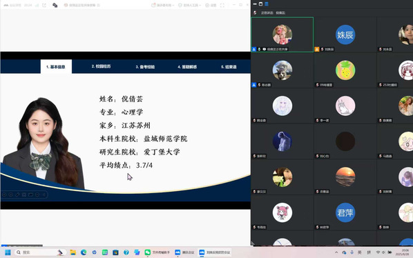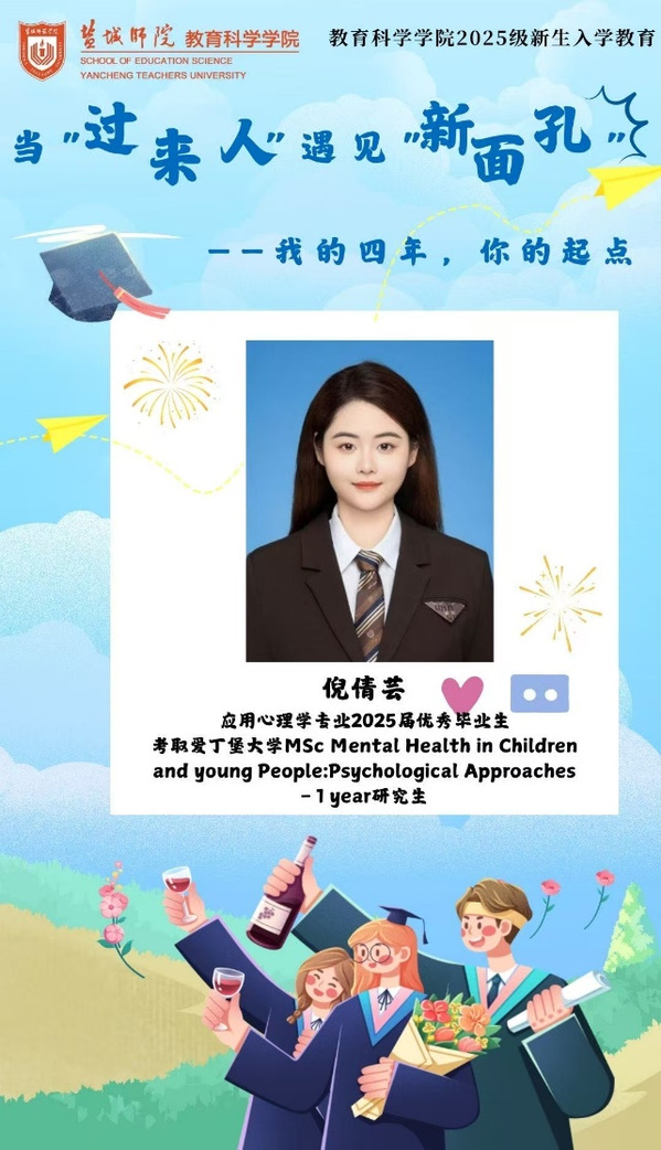 为帮助新生快速适应大学生活,打破认知壁垒,明确成长方向,8月28日晚,学院邀请2025届应用心理学专业优秀毕业生倪倩芸作为“当‘过来人’遇见‘新面孔’:我的四年,你的起点”主题分享会第9期分享者。以不懈努力敲开世界名校大门,倪倩芸成功申请到英国爱丁堡大学研究生。从校园里的深耕学习,到跨越国界的追梦之旅,倪倩芸的故事里,藏着关于“勇气”与“远方”的独特注解。