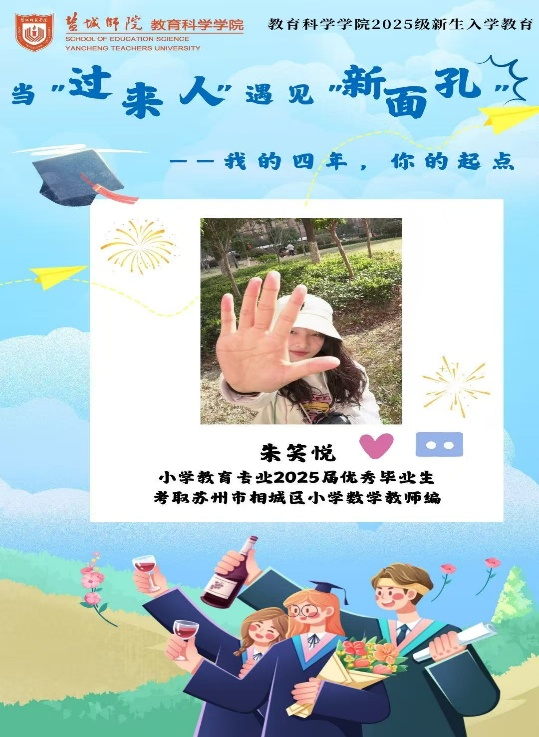 为帮助新生领略到专业学习和技能训练的高效方法,明确大学生活的成长方向。8月25日晚,学院邀请2025届小学教育专业优秀毕业生朱笑悦——一位考编“过来人”作为“当‘过来人’遇见‘新面孔’:我的四年,你的起点”主题分享会第6期分享者。大学四年间,她劈波斩浪,积极进取,最终考取苏州市相城区小学教师编。从青涩迷茫到成熟坚定,跨越梦想与现实的距离,朱笑悦用四年的光阴完成自我的磨砺,于毕业季收获了成功的果实