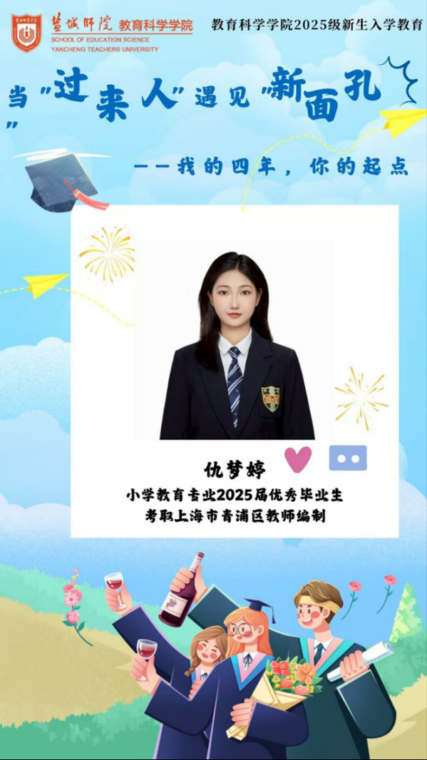为帮助新生快速适应大学生活,明确职业规划方向。学院邀请2025届小学教育专业优秀毕业生仇梦婷作为“当‘过来人’遇见‘新面孔’:我的四年,你的起点”主题分享会第8期分享者。通过大学四年的努力,仇梦婷在今年成功上岸了上海市青浦区的教师编制。她的四年,是行稳致远的四年,是我们的好榜样。勇敢追梦,不负韶华